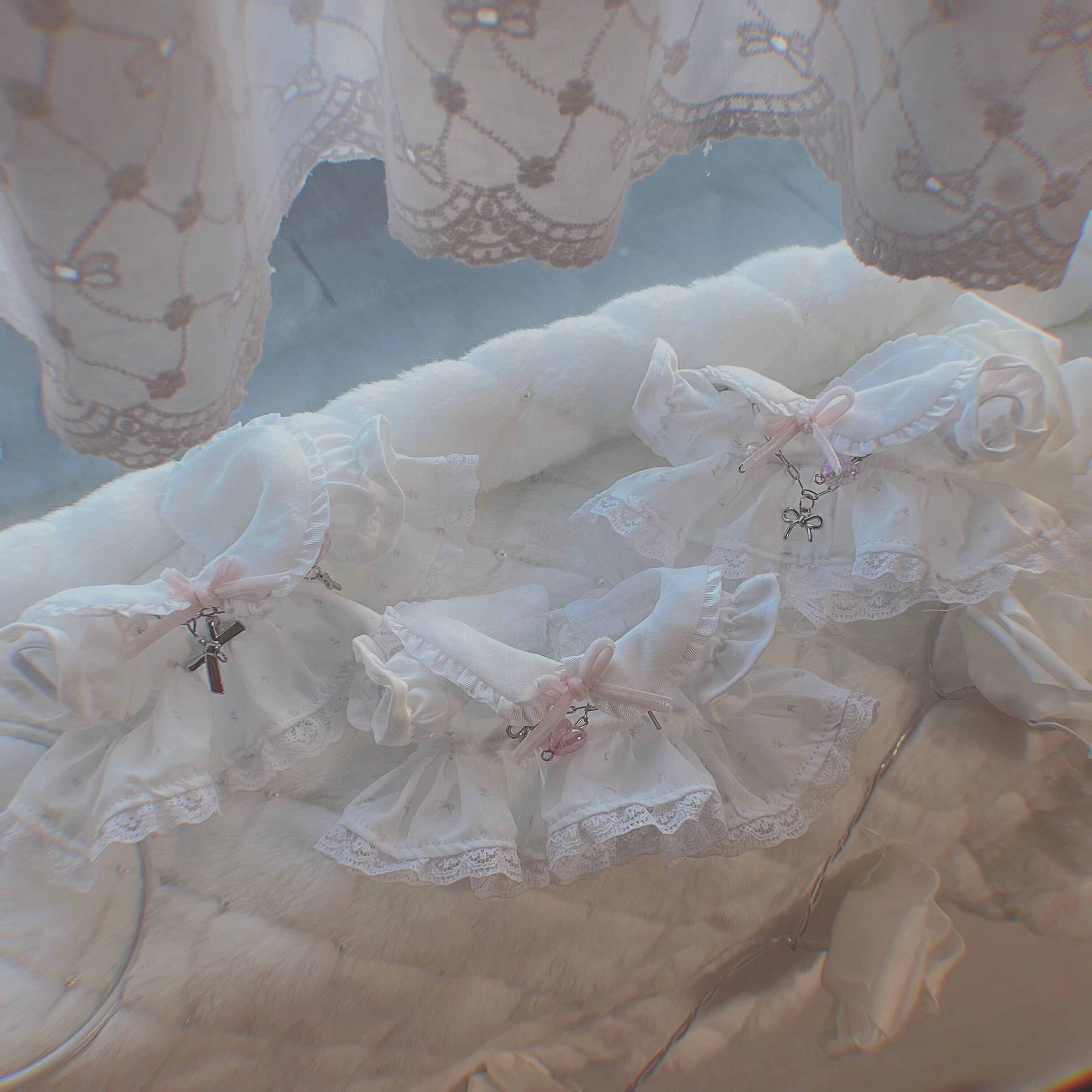 家庭用ミシン、一部手縫い、手芸用ボンド、瞬間接着剤で制作しています。チャコペン、ほつれ止め液、ボンドの跡やシミなどある場合がございます。